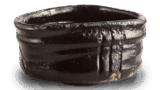 Shallow wheel marks run smoothly in several layers, and the carving on the side of the foot is not too deep. Despite its height, the foot is rounded, contrasting with the sharp lines of the Sakihaya style. The strong feldspar glaze is applied generously, so the blackness of the clay is barely visible, giving it a bright, smooth color. Due to the thickness of the glaze, bubbles have burst on the surface, creating white rings around them, giving it a unique appearance. The crackles on the inside and outside of the foot are fine, and the rim is high and imposing. Along the edge of the high stand, large glaze pools cluster together, creating an exceptionally charming and mysterious ambiance.