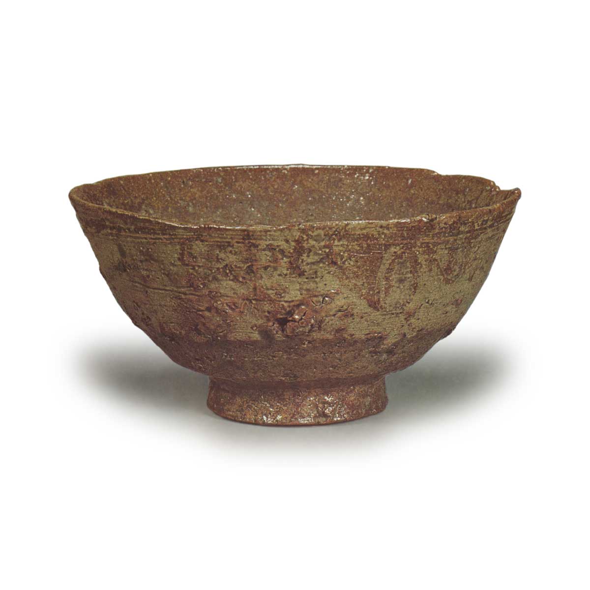 The sand-mixed clay body has fine veins, and among the many stone inclusions, the one on the front is particularly prominent. The tea-stained area is beautifully reddish, and six dots are faintly visible. The high foot is sturdy and well-defined, and the nail carving is a highlight. Judging from the style, this is likely an early Edo-period piece from the vicinity of Busan, reflecting the preferences of tea connoisseurs.