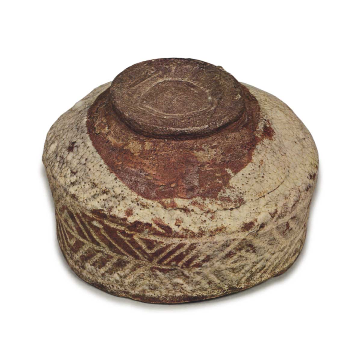 This tea bowl was made using the Nezumi Shino technique, in which the Mishima pattern is scratched off to create an inlay effect. The finished bowl has a reddish hue, resembling Akashino.