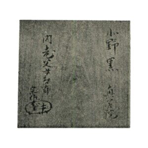 This tea bowl was owned by Rikyu and was used at the Kitano Tea Ceremony, hence its name. It is also known as Kitano Kuro.It was once owned by Rikyu, as evidenced by the box inscription and accompanying documents by Eison, and is particularly associated with Rikyu.