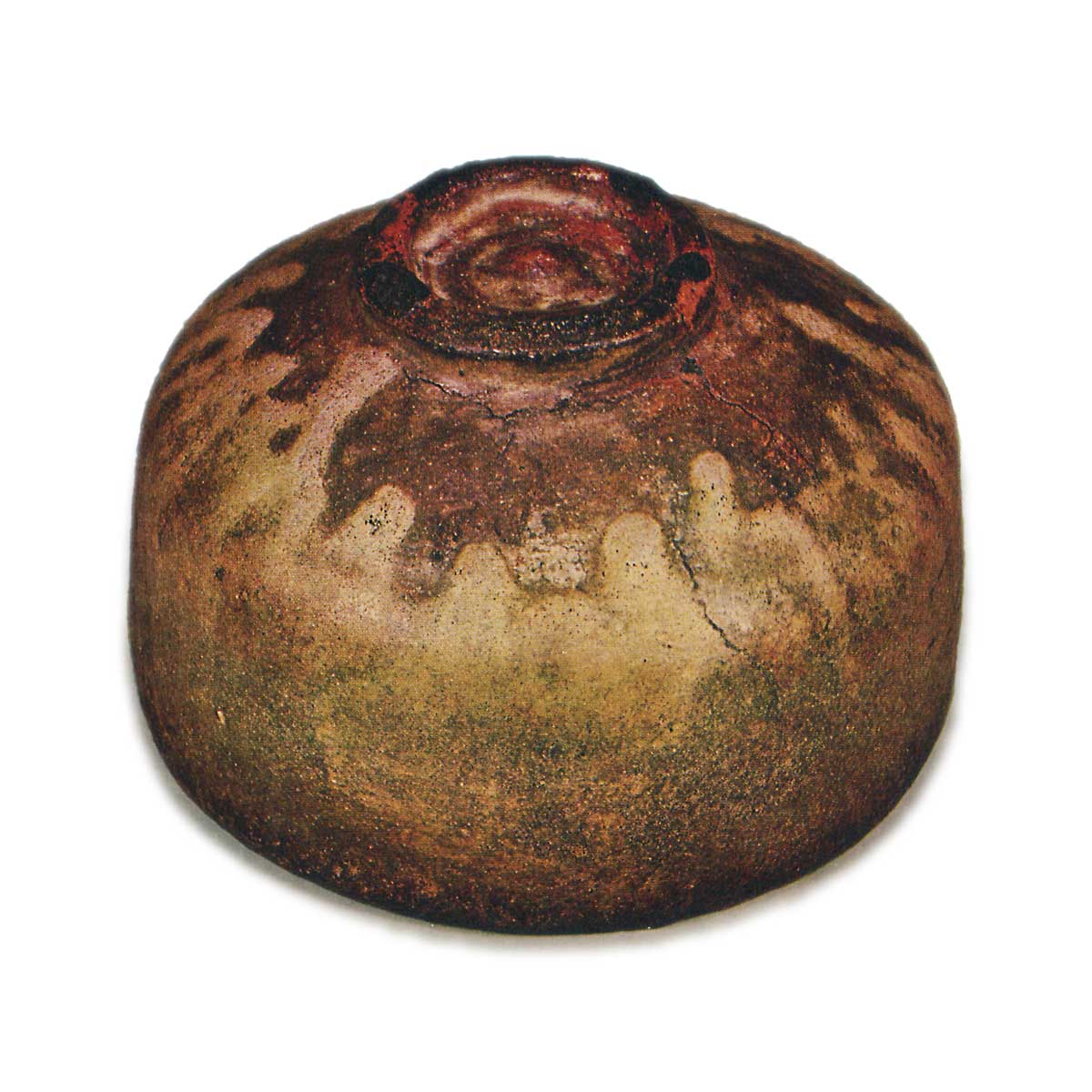 It resembles the style of Tōyōbō, with a waist-high form that reflects Rikyu’s preferences. The mouth is slightly curved inward, the body is thick and rounded, and the foot is deeply cut with a swastika pattern inside. The lid and tea-holding basin have holes. The glaze is overall a dull reddish-brown, but the rim is white, and the glaze accumulation is particularly prominent, creating a scenic effect around the foot.