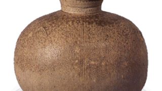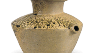 This is a typical example of 9th century long-necked vase with a thick, upright neck. It is made of fine grayish-white clay and is well fired, with a dark green ash glaze on the shoulders.