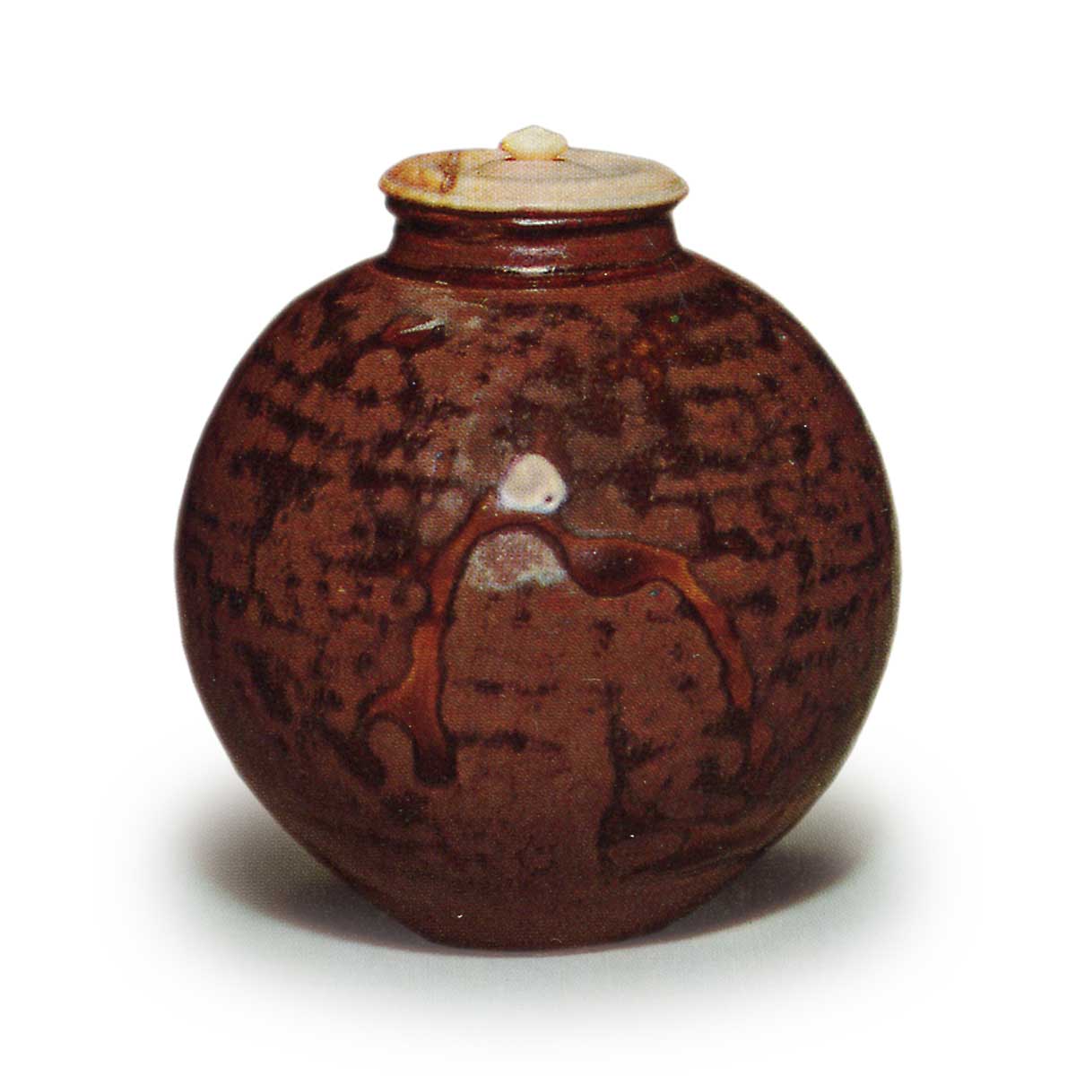 The glaze is reddish with dark mottling, and between the mottling, a yellowish glaze flows from the center to the left and right. Between the glaze, there is a single dot where the glaze has been removed, creating an interesting pattern. The clay is white, and there is a trace of where the corner was cut off.