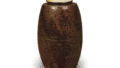 A rich brown glaze is applied evenly, with two gentle glaze flows starting from the middle of the body. One flow extends to the edge of the base, while the other remains exposed in the middle, creating a pleasing composition.