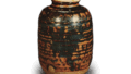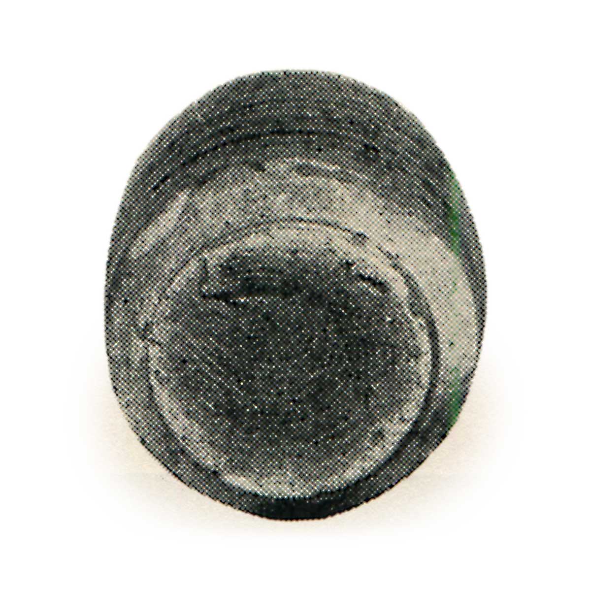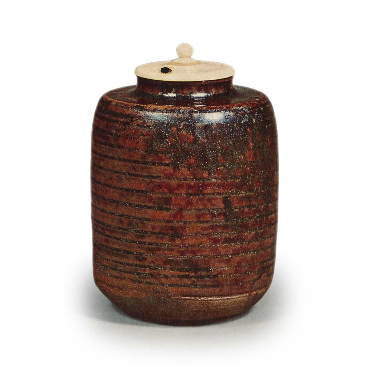 One might call it a representative example of an old Seto tea caddy.Its rim appears light and delicate, the shoulder corners rounded, the base showing a slight swelling before tapering inward, with the clay visible near the base edge. Moreover, the unusual design features lines running from below the shoulder across the entire body down to the base. Overall, the Seto glaze is unevenly applied, creating a shoulder-strike tea caddy with a unique, austere charm enhanced by a sense of weight.