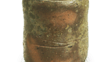 Among ancient Seto tea caddies, this one stands out as unique. Its form features a neck that dips sharply into the shoulder, creating a boar’s head shape with pronounced angular shoulders. The body tapers gracefully down to the base, evoking the silhouette of a farmer clad in a straw cloak.