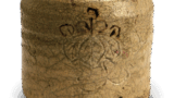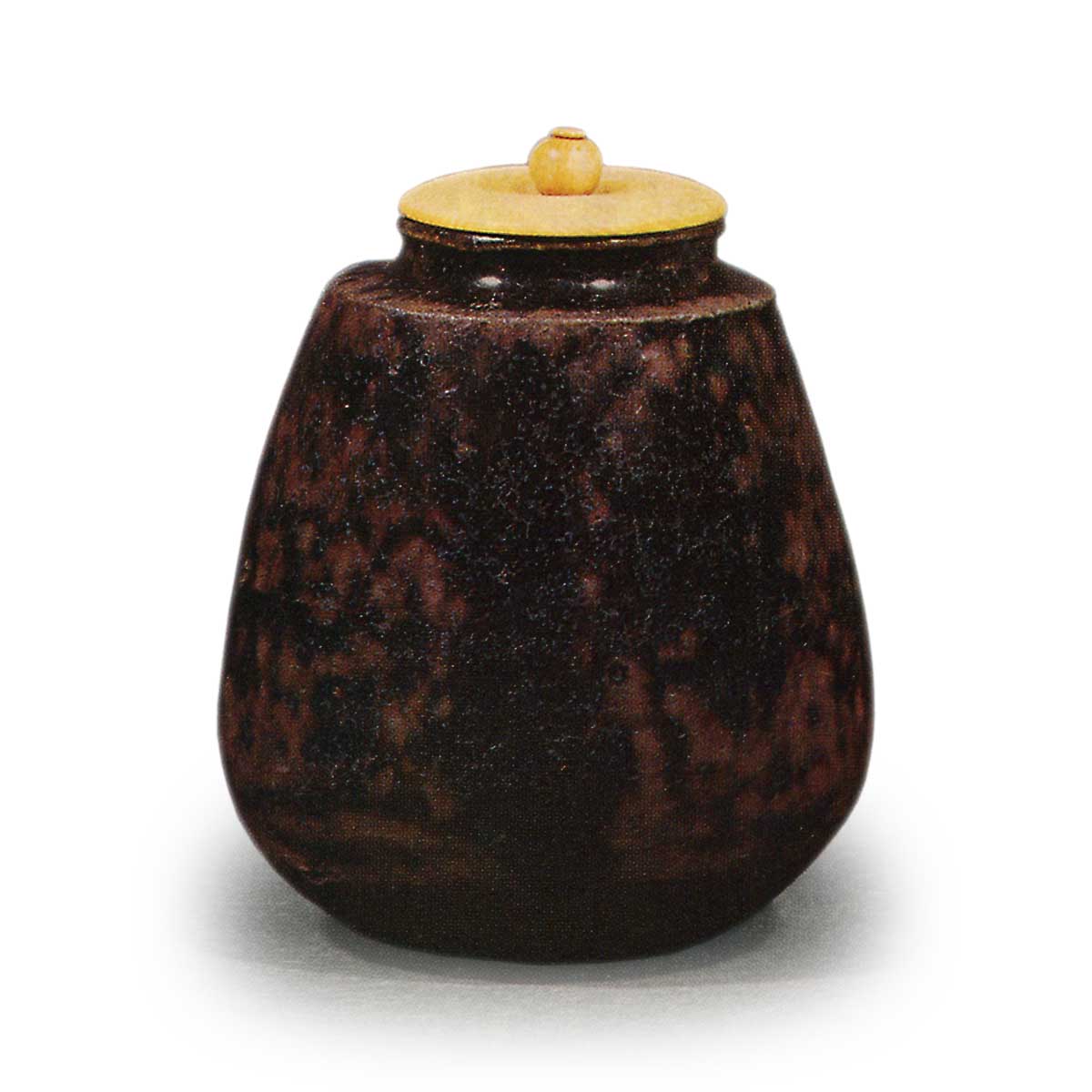 This tea caddy, as its inscription suggests, is a superb example of wabi-style ware from ancient Seto kilns. The inscription “Iyo-sori” is derived from a poetic name. Its shape might be described as a small, tapered shoulder-style caddy with a narrowed lower body. It belongs to a type frequently found in ancient Seto kilns.