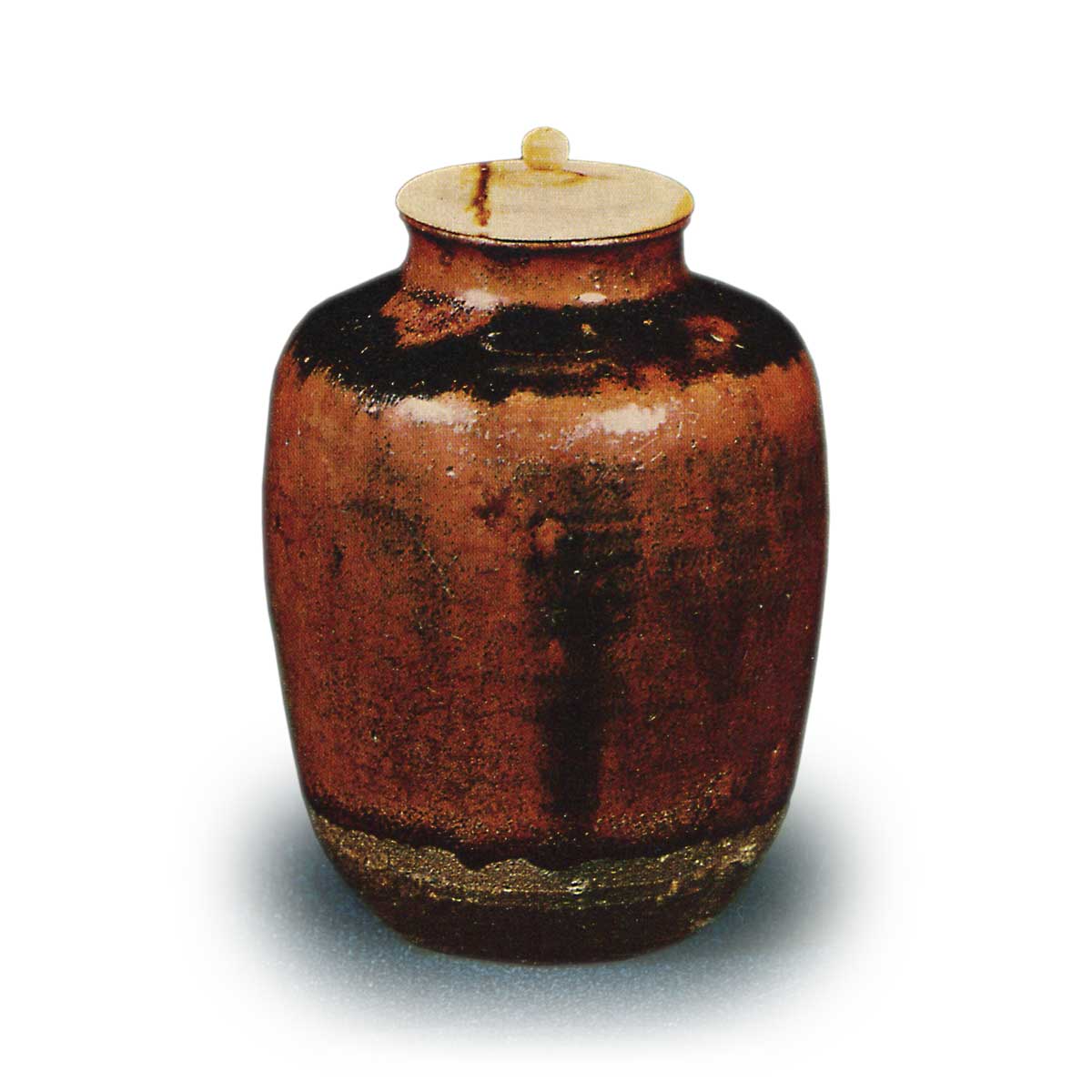 Sakai Kūin was a disciple of Enshū, renowned for his tea ceremony skills. It is said Enshū presented this tea caddy to Kūin as a token of gratitude for his exceptional support. Tea caddies of this type feature uniformly gentle shoulder lines, with a slightly narrower base creating a soft silhouette.A reddish-brown glaze covers the entire body, with black glaze appearing across the shoulder area. A single, slightly thinner cascade glaze forms a pattern on the front, while glaze with a hint of gold accumulation is visible around the base. Consequently, one theory suggests that tea caddies with this shoulder black glaze were also called “shoulder black hand” (kakurote).The clay appears to be of the Kinka-yama type, with a slightly coarse texture. One example bears the kiln mark “Kyoto Asuka,” indicating it was fired in Kyoto. This is documented in Bessho Kichibei’s records, confirming the existence of a Kyoto-based maker.