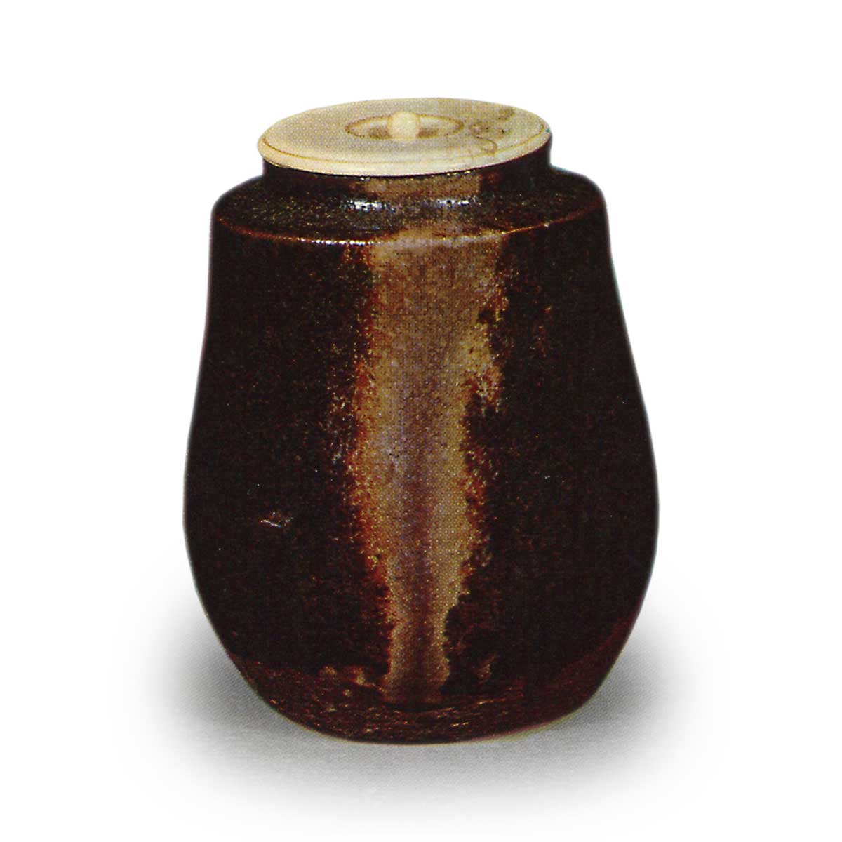 A blackish tea glaze covers the entire body. Within the finely textured glaze, yellow glaze cascades down from the rim toward the front. At its center, the glaze takes on a blackish hue, creating a scene reminiscent of a waterfall plunging vertically into a pool.