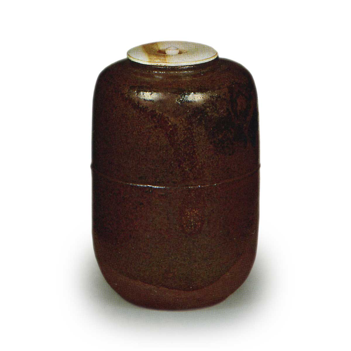 This hand-pillow-shaped tea caddy differs from the typically admired pieces with many striking features. Its wabi glaze is applied delicately, and the cascading glaze pattern stops midway on the body, just beyond a single indentation at the waist. Enshū selected this piece from among many caddies for its quiet, almost mysterious appearance.