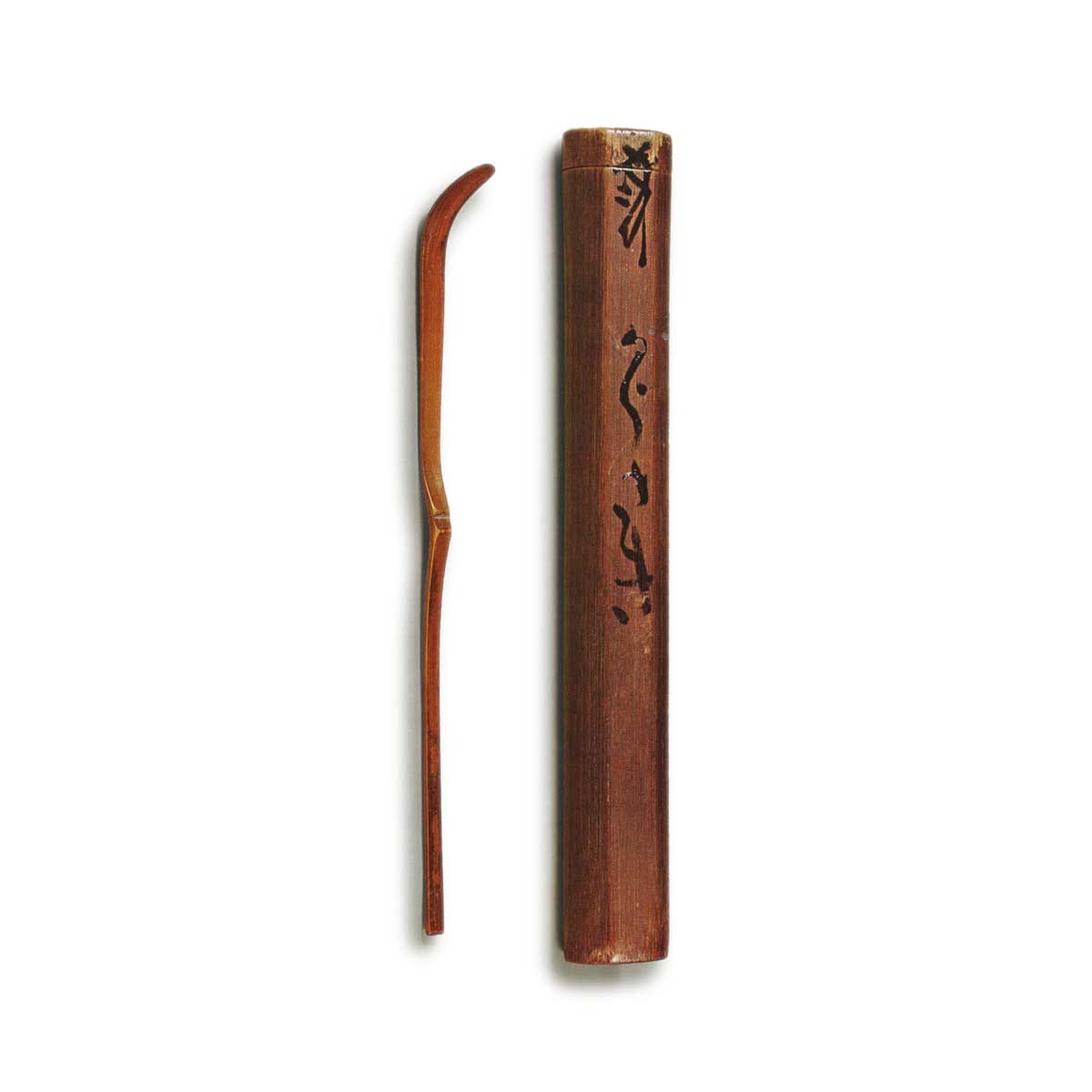 A true case with chamfered edges, bearing a kerabon seal as its mouthmark. Inside, Rikyu’s own hand writes “Karasaki” in lacquer. The absence of lacquer wiping on the scoop and the lacquer inscription on the case again pose a puzzle. However, since the case need not have been carved aboard the boat but could have been fitted later, the lacquer inscription is not problematic.
