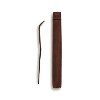 Made of soot-stained bamboo, the lacquer has not been wiped off. It is a prime example of the so-called Rikyū-style tea scoop, featuring a high waist (arikoshi) and a sharp, pointed tip. The absence of lacquer wiping is a rare feature for the Rikyū era. My personal interpretation is that, as this was an impromptu creation during a boat trip at Karasaki, the lack of lacquer wiping is natural.