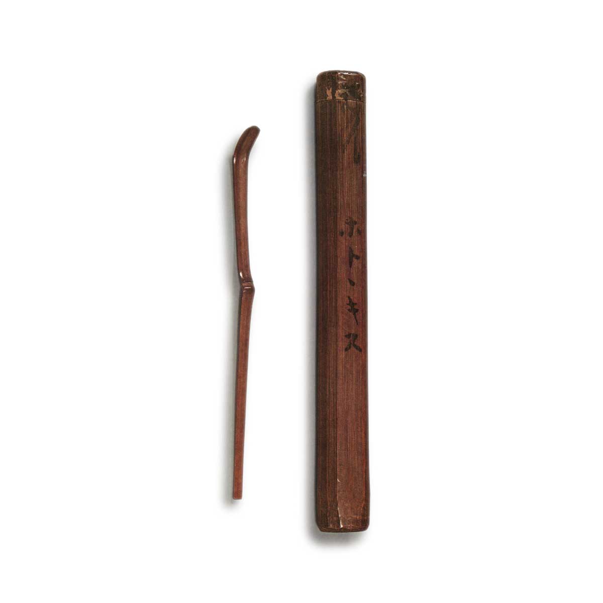 Though made of rustic bamboo, it possesses a lustrous sheen. Slender and short, it is used for wiping lacquer. The underside of the joint is deeply hollowed out, creating a pronounced hollow. In terms of shape, a noticeable warp to the left from below the joint is evident.
