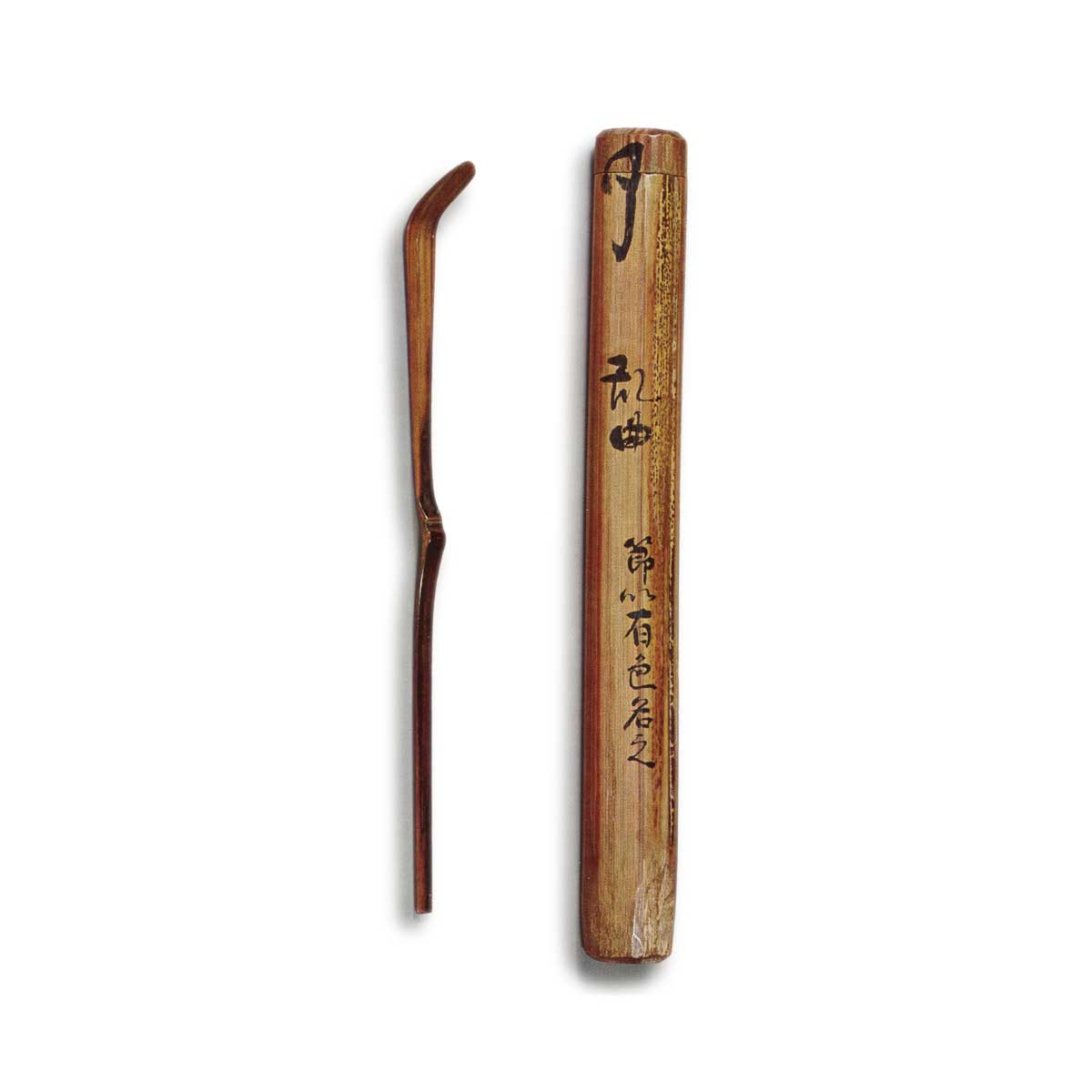 Made from the same bamboo as the scoop, bearing the mouth mark “Yū” in the same brushwork as “Kuse-mai,” likely indicating simultaneous creation. The case is heavily chamfered diagonally, with the sesame bamboo roughly shaved and left unfinished.