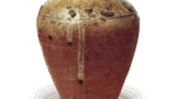This is one of the few complete Sanage ware of ash-glazed double-eared vase. The ash glaze is thought to have been applied to the entire surface except for a portion near the bottom, which has now completely peeled off. This two-eared vase has one more ear on the lower half of the body, but such three-eared vases are also found in early Sue ware from other regions, and date to the end of the 8th century.