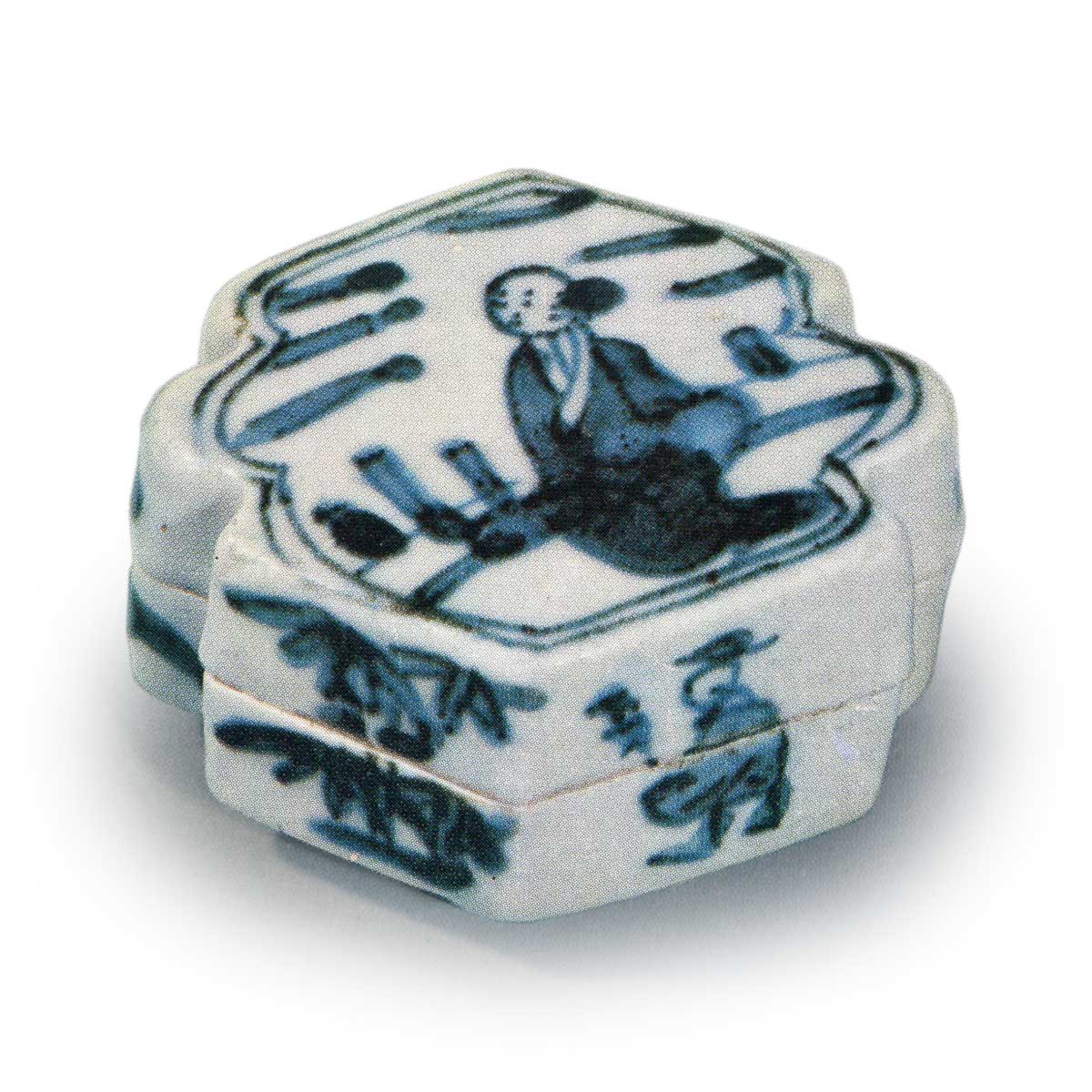 The shape of this incense container is very interesting, and the handiwork is well done, making it an object of admiration among tea masters. The design of the indigo gouzu painting shows a figure on the front of the lid, and sometimes the design is changed. The surrounding area is decorated with pictures of lumberjacks, and this pattern is uniformly depicted on all Kuresu Ai incense containers.