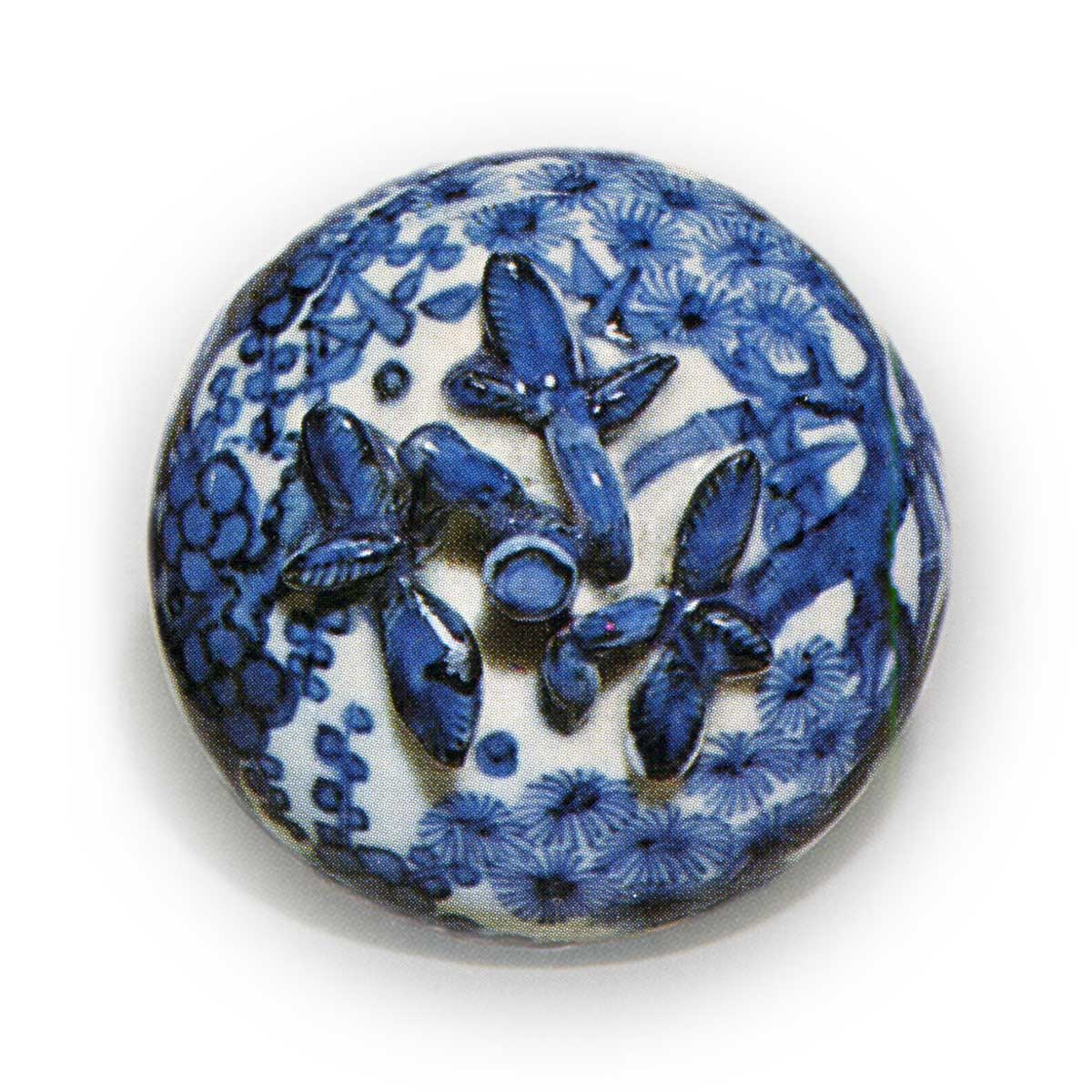 This incense container beautifully balances the characteristic white ground and indigo glaze of Shōzui, presenting them with striking clarity. Furthermore, the leaves attached to the mandarin orange stem with small branches, referred to as “nine-leaf,” boast the highest number of leaves and excellent firing quality. These two factors combined make it a representative masterpiece among the many Shōzui incense boxes.