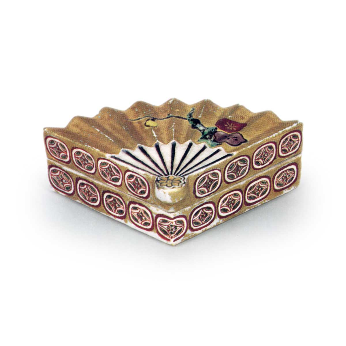 Its shape is an unprecedented open fan design, conceived as a fan or box lid for a medicine chest. The base is neatly formed. On the lid surface, plum branches are vividly painted on the fan surface, while the sides feature a pattern of seven treasures. The delicate gold coloring creates a unique composition.