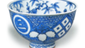 This is a copy of a Chinese blue-and-white tea bowl commonly known as the “Undo style.” The Yuki Art Museum’s collection includes outstanding examples of Undo-style copies, alongside those of the Shōzui and Kosen-tsuke styles. The semi-cylindrical body is adorned with three bands of iron glaze, and the exterior features a vividly colored design depicting clouds and pavilions. The piece is firmly fired throughout, though the foot and the area around it reveal a brownish clay body. The mark “Yongle” is stamped beside the foot, and the lid of the accompanying box bears the inscription “Replica of an Old Somenuki Undo Tea Bowl” on the front, while the underside of the lid is inscribed with “Mark: Made by Zenichiro.”