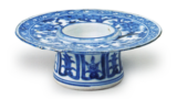 The bowl in Figure 220 has a slightly tapered body and rim. The footring is left unglazed, and the body is covered with a thick layer of bluish white glaze. In the center of the interior, the character “福” (fuku, meaning “good fortune”) is written in blue and red within a gold-painted circular motif. The exterior is divided into six sections, with floral motifs and fine diagonal lattice patterns alternately painted in red, gold, green, blue, and black overglaze.