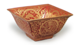 This elegant cup, modeled after the style of early Somenuki ware, features a stylized single plum blossom and a small bird—likely a nightingale—perched on the rim. The rim is shaped into a twelve-petaled floral ring, and a five-petaled plum blossom is painted on the interior. The foot is small, compact, and slightly tall, with a shallow indentation inside. A small “Eiraku” seal is stamped on the body, and the lid of the accompanying box bears the inscription “Somenuki Kachō Shu-in” (Underglaze-painted Flowers and Birds Sake Cup), while the underside of the lid is inscribed with “In: Hozen-zō” (Seal: Hozen-zō). I have also seen a cup stand made specifically to accompany this cup.