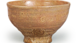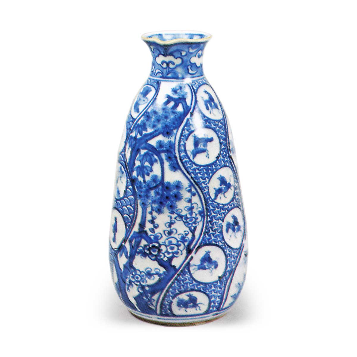 This is a stocky, bulbous tokkuri with a slightly wide mouth; it imitates the Shōzui twisted pattern, featuring six twisted raised lines on the body. Three sides are decorated with circular patterns, while the other three feature motifs such as pine, bamboo, and plum; landscapes with pavilions and figures; and boats navigating mountain scenery. The base bears a two-line inscription within a single circle reading “Made by Hozen in Hunan during the Yongle era.” The lid of the accompanying box is inscribed with “Shōzui Sake” on the front and “Made by Hozen in Hunan” on the back.