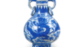 Although similar in shape to the previous illustration, this piece features a vivid Kinrande finish. The entire exterior is painted in a red ground, though the application is slightly uneven; on top of this, intricate patterns of peonies and insects are painted in gold paint. The mark “Kawabami Shiryū” is stamped at the base of the body and framed with blue-and-white porcelain decoration, with the mark itself left unpainted. The lid of the accompanying box is inscribed with “Kinrande Sake Bottle.”