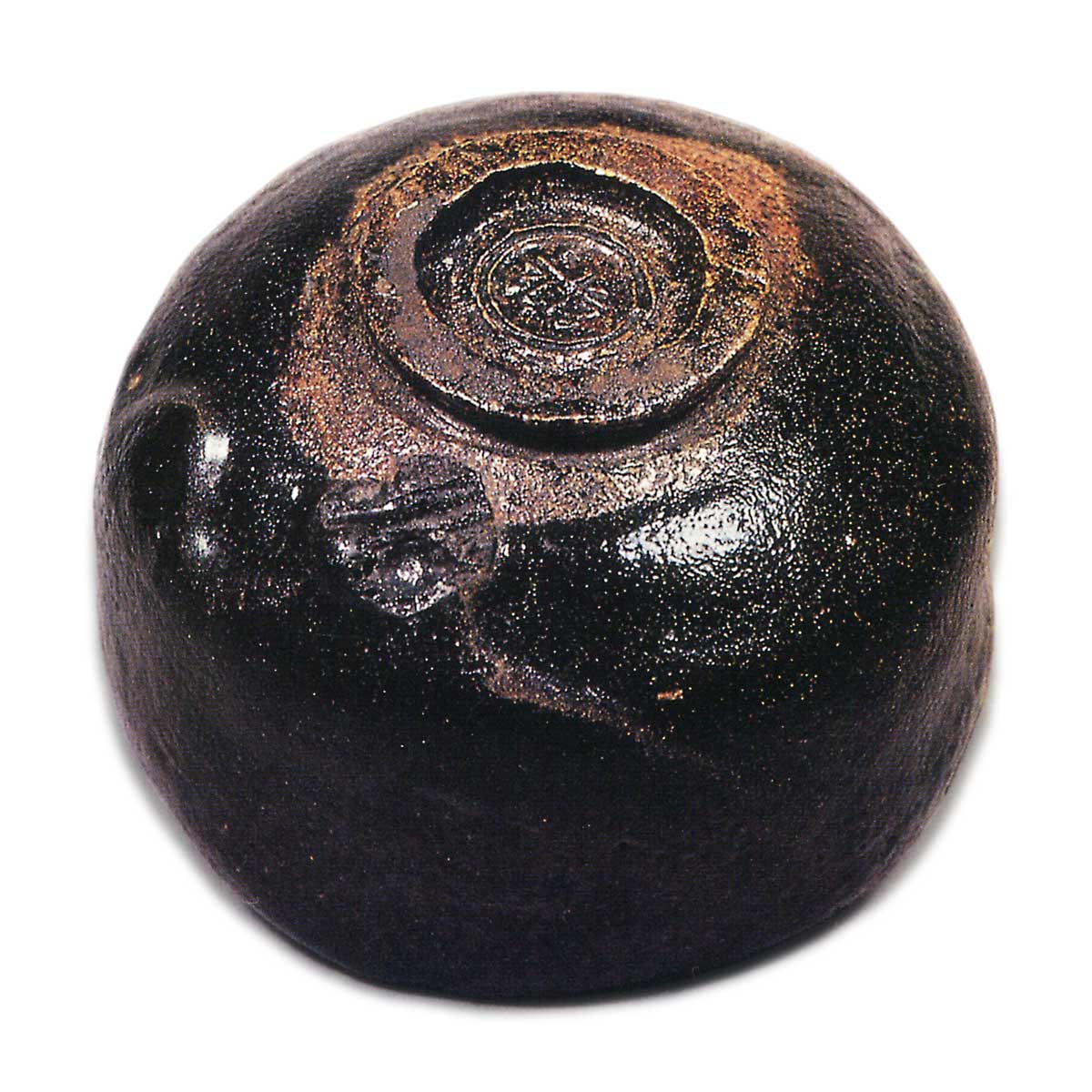 A jet-black glaze completely covers both the interior and exterior, but the glaze has flowed down to the lower edge on one side, revealing a faint white streak where the glaze breaks. This streak is caused by impurities drifting within the black glaze. Traces of the kiln shelf remain on the lower rim. While the form is gentle, this tea bowl displays techniques characteristic of Dōin throughout. One of the “Seven Varieties of Nonkō.”