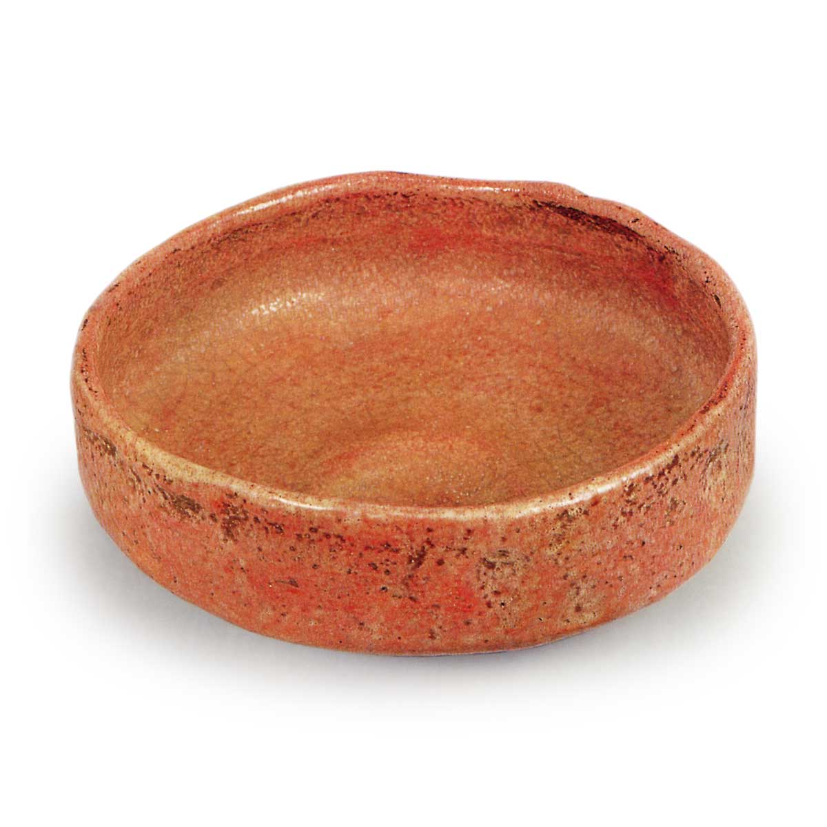 The bowl tapers slightly inward from the waist to the rim, features a stepped interior, and has a gently undulating rim. The foot is small and compact, with a distinct tomoe-shaped hood pattern carved inside; the carving around the foot is somewhat deep, and four flat grooves are carved from the edge of the foot to the waist. A clear, circular tea pool is carved into the wide interior. This is a tea bowl with a well-balanced composition. Although Sairyu was apparently skilled at imitating Kōetsu, this piece alone suggests he possessed considerable technical skill. It features Sairyu’s distinctive red raku style; the white glaze applied over the ochre base is somewhat thick, and the glazed surface appears as if a white haze has settled over the red ground. Raku tea bowls housed in their original boxes—especially those bearing inscriptions by the head of the school from the same era—are highly prized; in this sense, this piece can be considered a quintessential example of such a set.