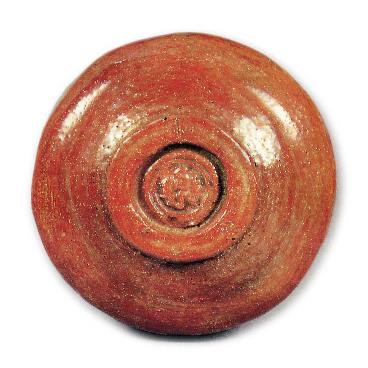 This is an outstanding piece among Tokunari’s red tea bowls, featuring a glaze reminiscent of Chōnyū’s style. The rim’s gentle undulations are shaped like the Five Peaks, the body is decorated with two bands of horizontal lines, and the footring and its surrounding area are adorned with a band of incised patterns. The foot is low, with a deep groove carved along its edge; the base is flat, and the character “Raku” is stamped inside the foot. The glaze is vivid, with some areas showing fire-induced color changes; the red hues vary from deep to light, creating a rich and varied effect. Three marks remain on the base.