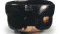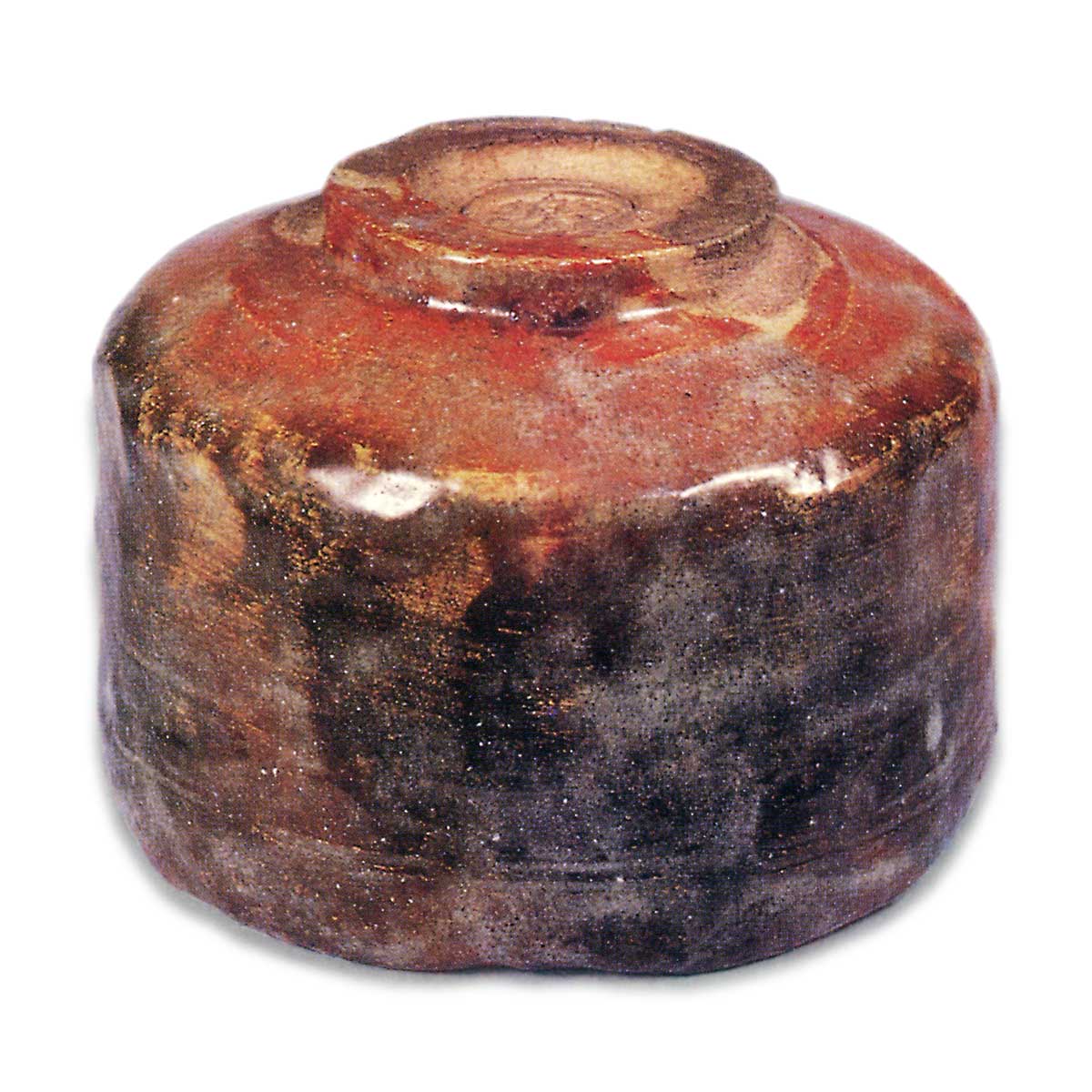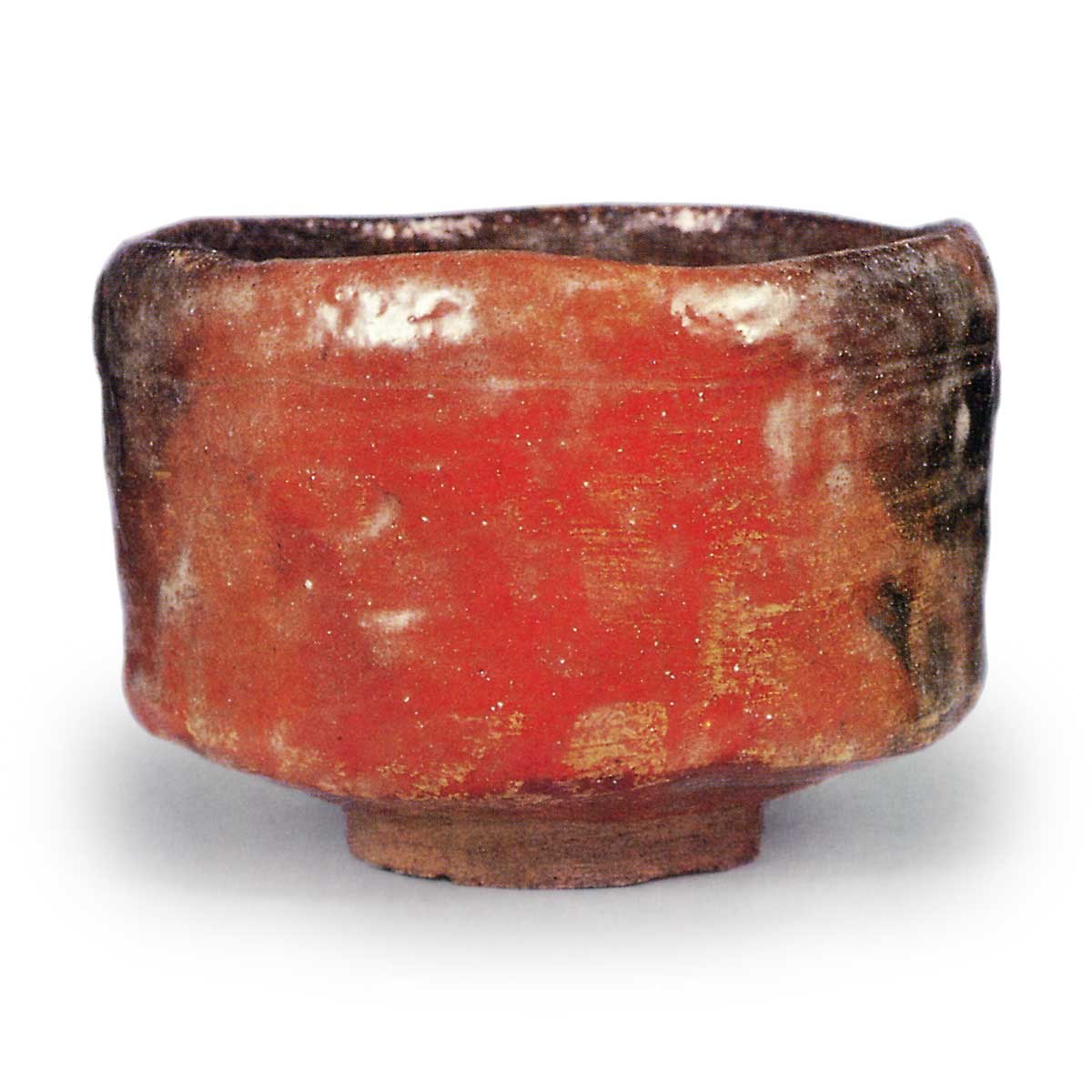 On the underside of the inner box lid, Rokuro-sai has inscribed: “Red Tea Bowl, made by Kichizaemon, Left (signature).” Needless to say, this piece was created during the period when Keinyu was known as Kichizaemon—namely, between the second year of the Kōka era (though the work is said to have been produced starting in the third year) and the fourth year of the Meiji era. While it is not as skillfully crafted as his representative work after shaving his head, “Irifune” (Fig. 30), it can be considered typical of his work from the Kichizaemon period. A “raku” seal—said to have been selected from the calligraphy manuals of Dong Qichang used between the first year of Ansei and the fourth year of Meiji—is stamped inside the foot ring; this seal is commonly referred to as the “naka-in” (inner seal), and this bowl is likely one of the earliest examples of a bowl bearing this inner seal. The rim, slightly curved inward, is shaped like the Five Sacred Mountains with gentle undulations, and the overall form is semi-cylindrical. A step is carved beside the foot, a basket-weave pattern encircles the waist, and vertical grooves are applied to the body. Meanwhile, greenish-brown fire-change patterns have appeared on both the interior and exterior, and the brushstrokes of the ochre applied over the raw clay remain yellow against the red glaze.