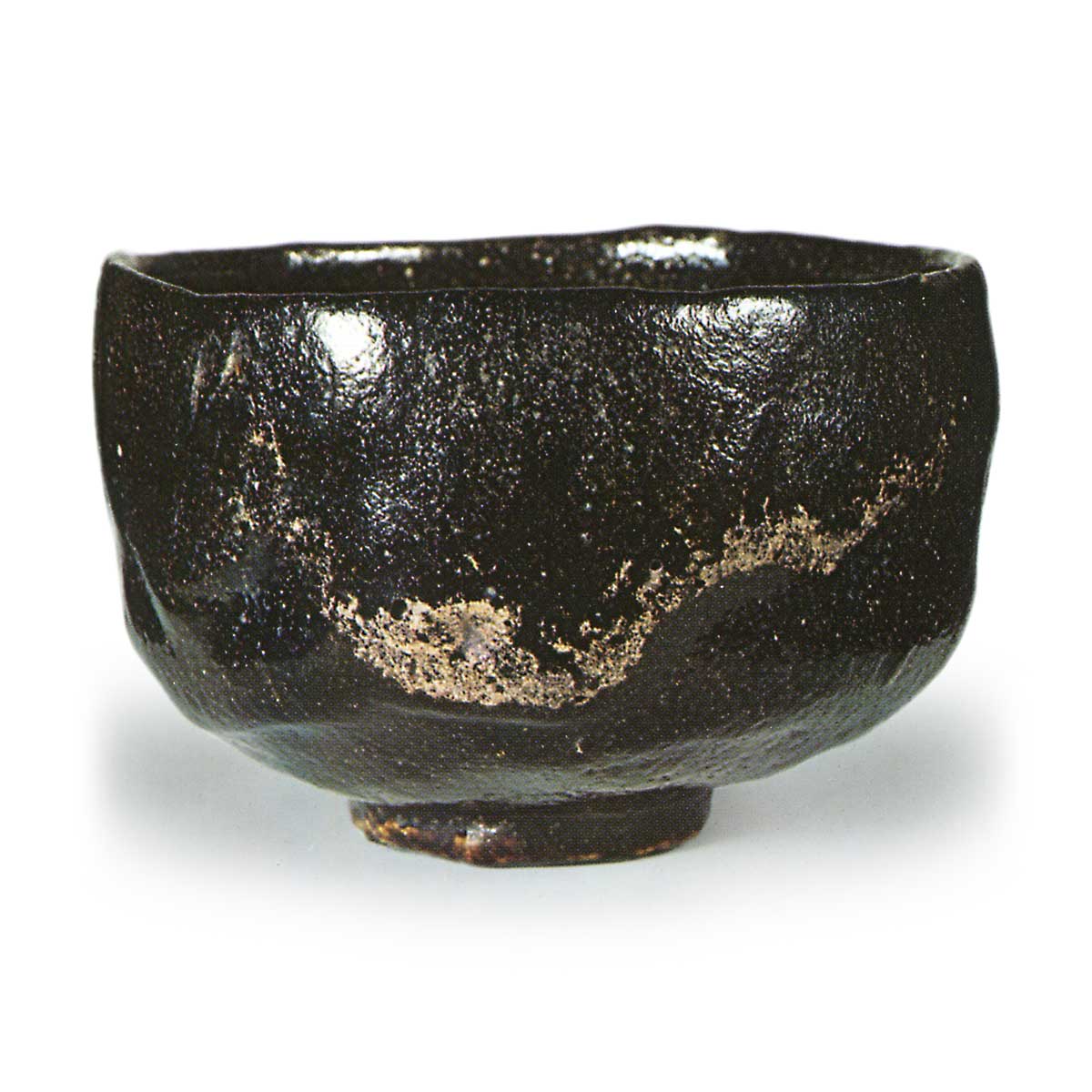 This is also a fully glazed piece, featuring the same glaze application as the black flat tea bowl inscribed “Enji.” It is somewhat large in size, with a clam-shell rim, a rounded body, a wide and deep interior, and a rounded foot. The entire piece is covered in black glaze, with thick drips of glaze hanging down on both the interior and exterior; white crackle patterns appear in some areas where the glaze has broken. Five marks remain on the foot, and the character “Raku” is stamped inside the foot, though it is unclear due to the glaze covering it. On the underside of the inner box lid, “Nonkō-saku Kurochawan Zangetsu Tsukuru (signature)” is inscribed by Tsukuru. This tea bowl has been passed down in the Fujita family.