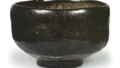 For a Dōnyū piece, this bowl is somewhat thickly made; the rim has undulations and curves slightly inward. While the body lacks a bit of roundness, Dōnyū’s characteristic style is still evident. The body features faint, flat chamfered knots. The glaze is somewhat thick and glossy, though pitting is clearly visible in some areas. There are three marks on the folded foot rim. On the underside of the inner box lid, Jushinsai has inscribed: “Nonkou Black Tea Bowl, Old Pine Left (Seal).”