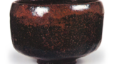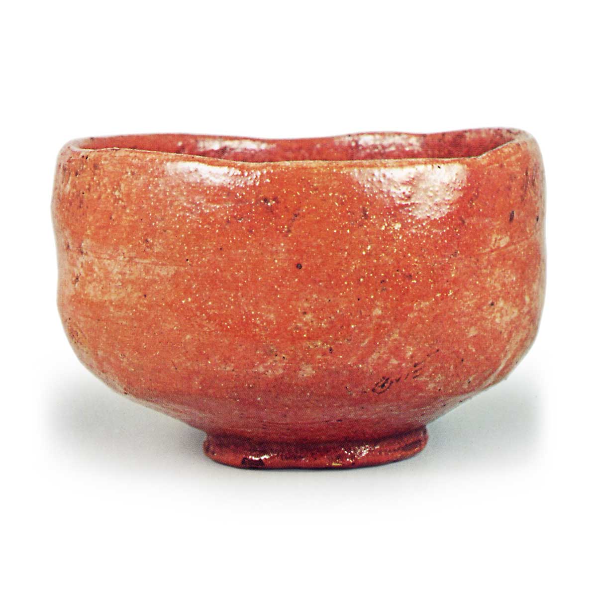 Left (Seal) This tea bowl shares the common style of the series, but features a tea pool in its deep interior. It is fired in a bright red raku glaze all over, though the slip appears to be slightly thicker than is typical for Dōnyū’s red raku tea bowls. The transparent white glaze applied on top forms uneven patches that appear hazy in places, and the character “Raku” is stamped inside the footring. On the underside of the inner box lid, Jushinsai has inscribed “Nonkou Red Tea Bowl, Left (Seal),” and on the lid’s surface, Takusai has inscribed “Nonkou Red Tea Bowl, Inscription by Jushinsai, Left (Seal).”