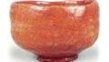 This is likely one of Dōnyū’s earliest red raku tea bowls, and its form appears to be based on the Chōjirō-yaki style. The rim curves slightly inward, the body is slender and taut, and the lower section is rounded yet slightly raised. The foot is sharply carved, with a flat footring, and the character “Raku” is clearly stamped inside the foot. Yellow earthenware clay was applied with a brush over the raw clay body, and glaze was applied over that, resulting in a glaze color that shifts like amber glaze. Furthermore, some areas from the rim to the body show fire-induced color changes, and brushstrokes appear in yellow in certain sections. This is one of the representative works among Michiiri’s red raku tea bowls. On the underside of the inner box lid, Ittō has inscribed “Nonkou Red Tea Bowl, Kan-kiku (seal mark),” and on the outer box, Fuzan Seikō has inscribed “Nonkou Red Tea Bowl, also inscribed by Gensai, Kan-kiku (seal mark).”