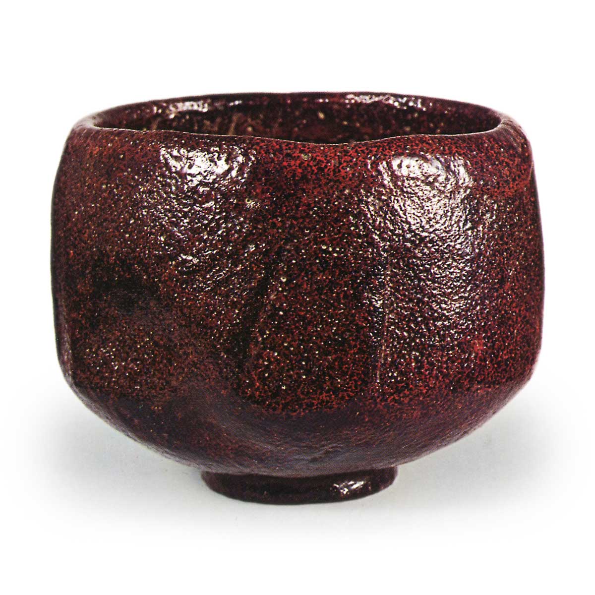The bowl is slightly thick overall, with a broad midsection and a rim that curves inward. The body features four raised dots, with indentations between them—a design that is unusually elaborate for a bowl by Ichinyū. The lower part of the body is rounded, and the foot is small and compact, with a distinct kabuto-kin (helmet-shaped indentation) carved into its interior. The glaze applied to the entire piece reveals a vermilion hue, with patches of vermilion glaze clumping together in a mottled pattern in places. On the underside of the box lid, Fuzan Seio has inscribed “Ichinyu Black Tea Bowl: Akebono (seal).”