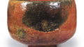 This is a small, flat tea bowl with a tightly drawn body and an inward-curving rim; the lower part of the body rises diagonally to form a small foot. The black glaze covering the entire bowl is smooth and well-fused, with vermilion glaze appearing on two sides of the exterior.