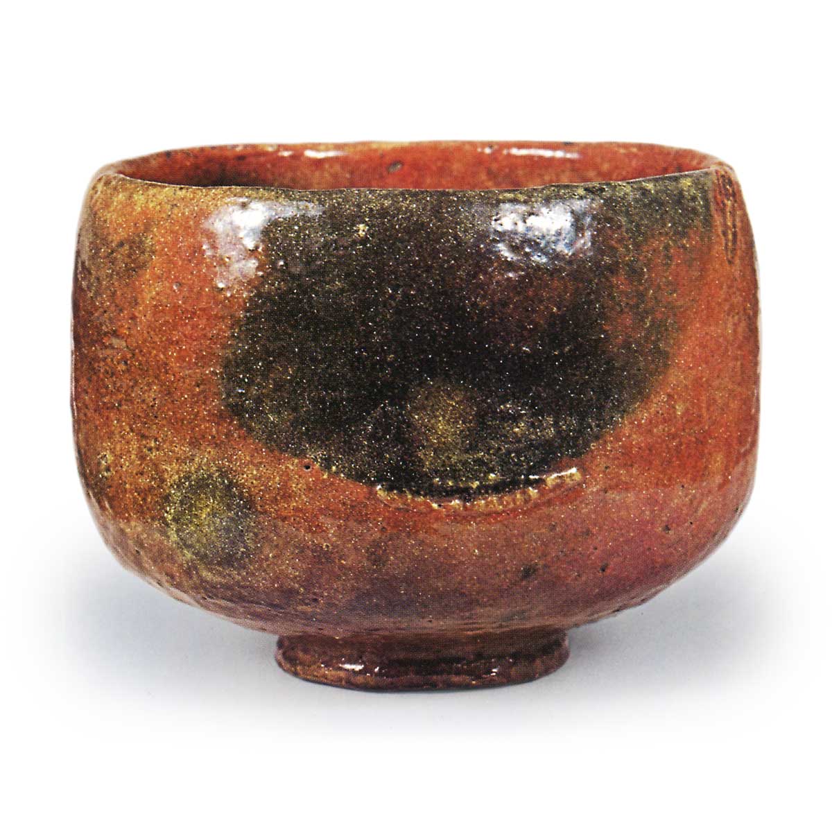 Although it is thinly formed overall, this piece can be considered a typical work by Ichinyu, emulating the style of Chojiro. With a slightly curved rim reminiscent of Chōjirō’s “Ōkuro” and a rounded body, the piece exudes a gentle, serene quality. The foot is narrow and compact, with a subtle, swirling pattern carved into its interior. A layer of ochre was applied beneath the transparent glaze covering the entire piece, resulting in a vivid red tea bowl. Additionally, a blackish fire-change pattern adorns one side of the body, adding to its visual appeal. On the underside of the lid, Jushinsai has inscribed: “Ichinyu-saku Red Tea Bowl, Aya-ha-sha (signature).”