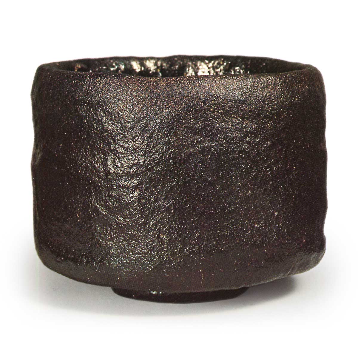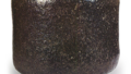This is a semi-cylindrical tea bowl with the rim slightly pressed inward. A large foot is attached to the bottom, and the interior of the foot is shallowly carved. The interior is deep, with a pool for tea at the bottom, and the black glaze applied over the entire bowl has a smooth, velvety texture on both the interior and exterior. Three kiln marks remain on the narrow, rounded foot rim. On the underside of the box lid, Chokusai has inscribed: “Sōnyū Black Tea Bowl, Umegoromo (seal).” This tea bowl has been passed down within the Raku family.