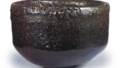 This semi-cylindrical tea bowl features a slightly inward-curving rim and a flared body; part of the body has been flattened and carved diagonally with a chisel. The flat bottom is fitted with a small foot ring, which is unusual for Sōnyū; the interior of the foot ring has been carved out to create a flat, single-layer foot ring with a stepped edge. The black glaze, applied leaving the foot ring and part of the side of the foot ring exposed, has fired to a rough, skin-like texture. Unusually for a Sōnyū work, red glaze appears on part of the rim, and glaze has also adhered to the stepped edge of the foot ring. Three kiln marks remain on the foot, and a single kiln flaw runs from the foot to the body. On the underside of the box lid, Jushinsai has inscribed: “Sōnyū Black Tea Bowl, Flute Left (Seal).”