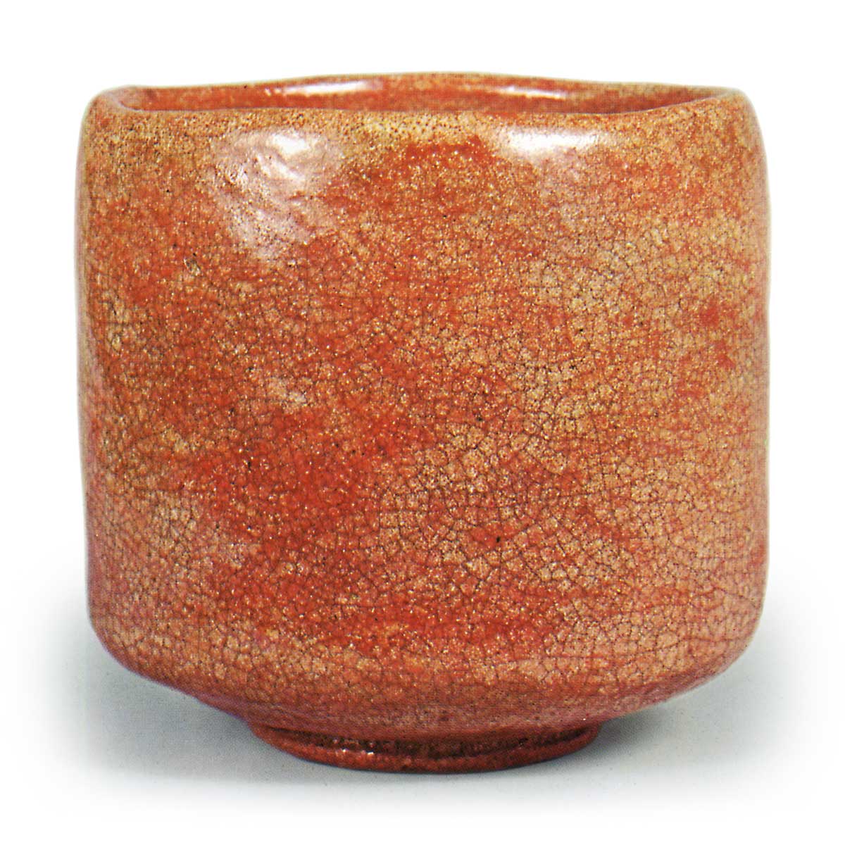 This is a tall, cylindrical tea bowl with undulating contours at the rim and a slightly inward-curving body. The glaze is thickly applied over the entire surface, resulting in a pale red raku finish with a whitish hue. The footring is wide, similar to that of the Red Tea Bowl inscribed “Friend of the Night’s Cold,” with incised patterns running along the sides of the footring. A swirl-shaped hood pattern is carved into the interior of the footring, and three tool marks remain on the footring’s surface. On the side of the foot, Kyūkōsai has written in vermilion lacquer, “Yakan no Tomo, Left (seal mark),” in his own hand. He has also inscribed “Red Cylindrical Tea Bowl by Sōnyū, Yakan no Tomo, Kyūkō” on the underside of the box lid.