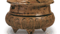 The flat body of this vase is identical to the body of a koshi incense burner of the same period, and it is thought to have been made around the beginning of the 15th century. It is made of high-quality grayish-white clay and is water-glazed with a separate foot. The ash glaze has a beautiful light green color and a stable glaze tone. Although there are some repairs to the mouth rim, this is one of the finest wide-mouth vases in the Zon style.