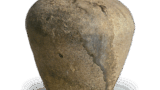 The inscription on the back reads “Grandmother Kaftokoro, Late Eisho 9 Uzuki, Kato Kuchikage” and is one of what is commonly known as grandmother kaicha. In the 16th century, the shape of the tea pot changed to one with a strong shoulder tension and an inward leaning oral part, as shown in this vessel. The clay is gray and of grandmother’s bosom clay. The base is made of gray grandmother clay, ground thinly, and the underside is ground to the left in a clockwise direction. The oil layer is thin, and the body is covered with a blackish-brown Kosedo glaze, but the glaze is remarkably uneven.