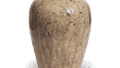 During the peak period of the Koseto ware from the end of the Kamakura period (1185-1333) to the Nanbokucho period (1392-1333), large vases over 30 cm high and small vases like this one were produced in small quantities, along with the common plum vases of 25 cm high and later . The round-shouldered, stubby shape has a small band at the mouth and a thicker band on the lower half. The seal and flower design on the entire surface is characteristic of this period. The camellia design on the shoulder is the main design, with a small rounded sword-tip design on the upper part and a taller rounded sword-tip design and twenty-six circles stitched on the lower half.