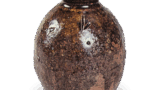 The correct shape of the oral part cannot be determined because the mouth rim has been repaired. The shape of the mouthpiece is a strongly puffed-out one with a taut shoulder, which was common during the peak of the Inka period. It is wheel-thrown. The design consists of three chrysanthemum seal designs set in pairs on the entire surface of the shoulder and the lower part of the body. Nine hemp-leaf style sealed floral motifs are also stamped on the upper rim of the shoulder. The iron glaze is a brownish-brown candy glaze with marked unevenness. The lower half of the body has been thinned.