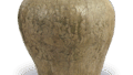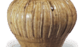 This wide-bodied jar has a slightly outward-curved mouth with a strong shoulder. The design is a tan arabesque pattern painted in thin lines in the center of the body. The large blank spaces at the top and bottom are also indicative of an older style. The iron glaze is a reddish brown with many black patches, and the shoulders have a yellowish brown color.