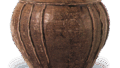 This is a rare water vessel used as a bone container. The spout, handle, and base are missing. It has a so-called “Kinuta” shape, which is an imitation of a similar white porcelain pitcher from the Southern Song Dynasty in China. The body is decorated on both sides with a large peony design carved in a thick circle. The ash glaze is a beautiful light green color.
