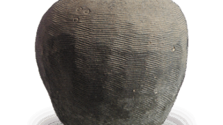 This water jar is of a general shape with a flat bottom. The mouth rim is double-rimmed, which is rare for a water vessel. The design is in the inka (sealed flower) technique, with petals on the upper rim of the shoulder and a simple arabesque design stitched in the center of the body. The ash glaze has been stabilized by the addition of feldspar and has a slightly dark green color with some whitening.