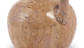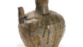 This water jar with a rounded, bulging body and small mouth and neck appears slightly past the peak of the Koseto period. It is made of grayish-white, slightly rough clay, and is shaped by rolling up the clay. The body and shoulders are decorated with chinkansen lines, and between the lines are four sets of three chrysanthemum-shaped floral motifs. The ash glaze has been stabilized by increasing the feldspar content, and is slightly oxidized and dark green in parts.