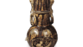This is a common Buddhist vase with a long, narrow orifice and a lily-shaped mouth. The body is decorated on all four sides with plum blossom arabesque designs in the inka technique. The iron glaze has a bluish-black color due to its high ash content.